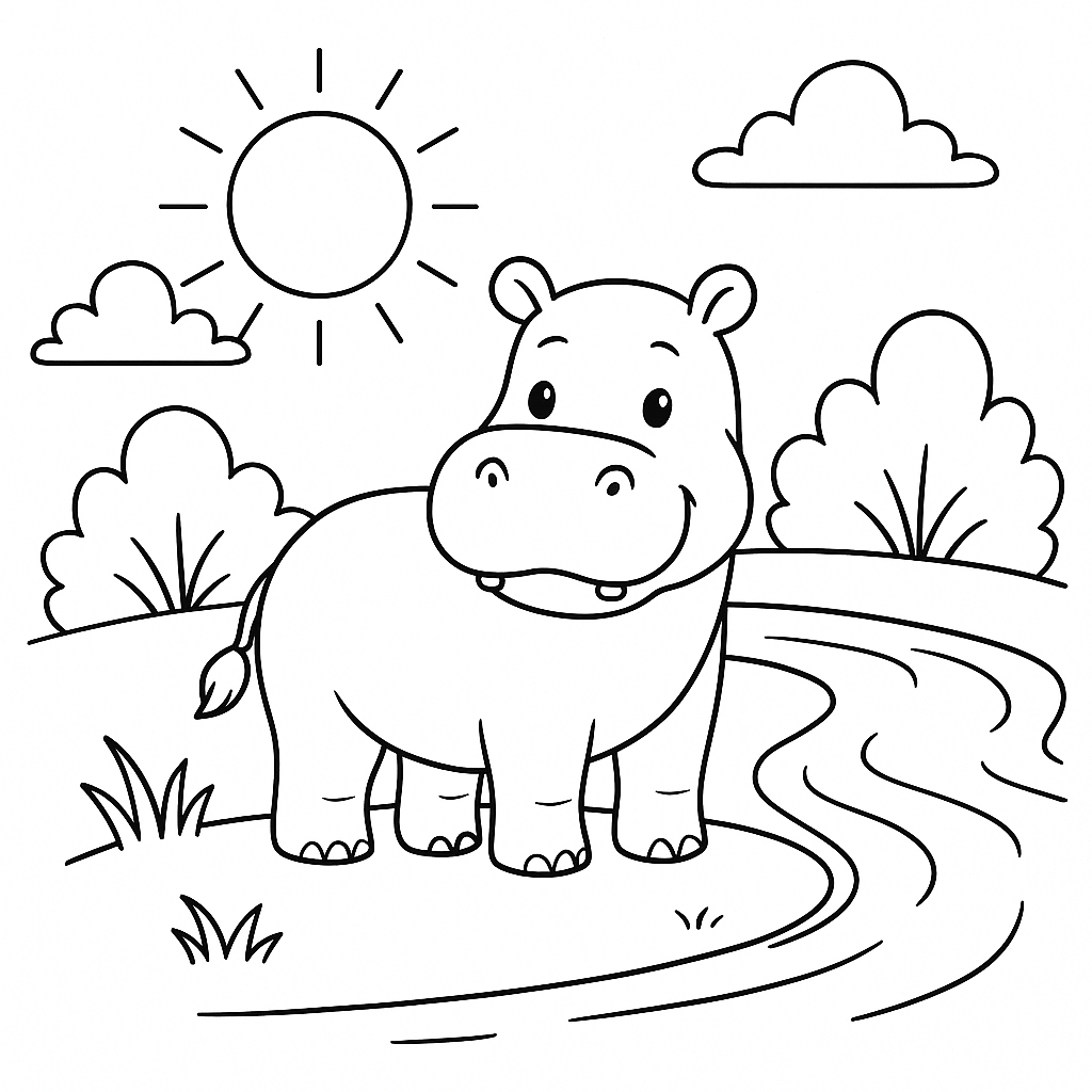 GeGet ready for a fun coloring adventure with this cute hippo coloring page! This happy hippopotamus is standing beside a bright blue river under the sun — perfect for kids and anyone who loves adorable animals.