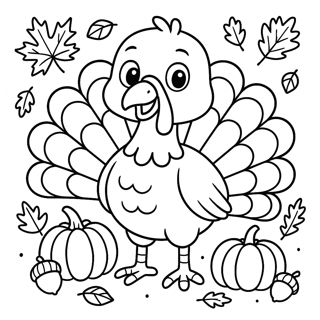 Celebrate the fall season with this cute turkey coloring page! This happy turkey is surrounded by pumpkins, acorns, and autumn leaves — the perfect way to enjoy a cozy coloring activity for Thanksgiving. As you color, imagine this friendly turkey showing off its colorful feathers in a golden autumn garden. Use warm shades of orange,…
